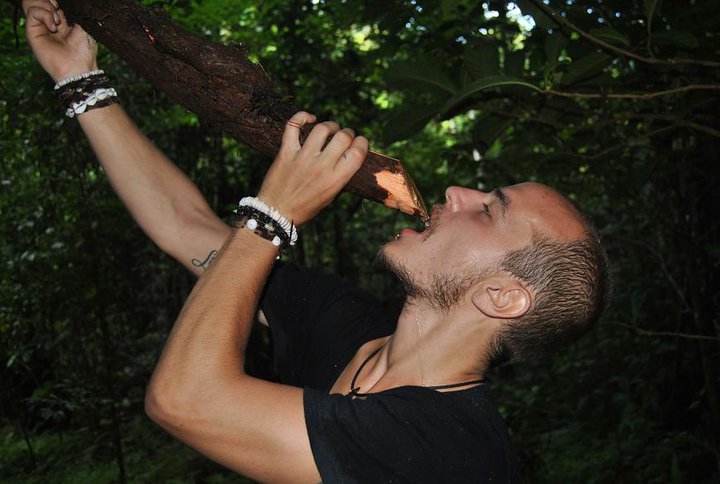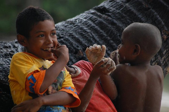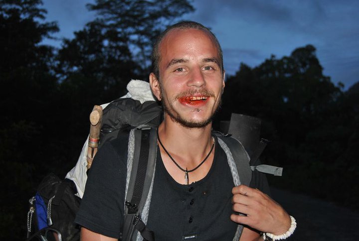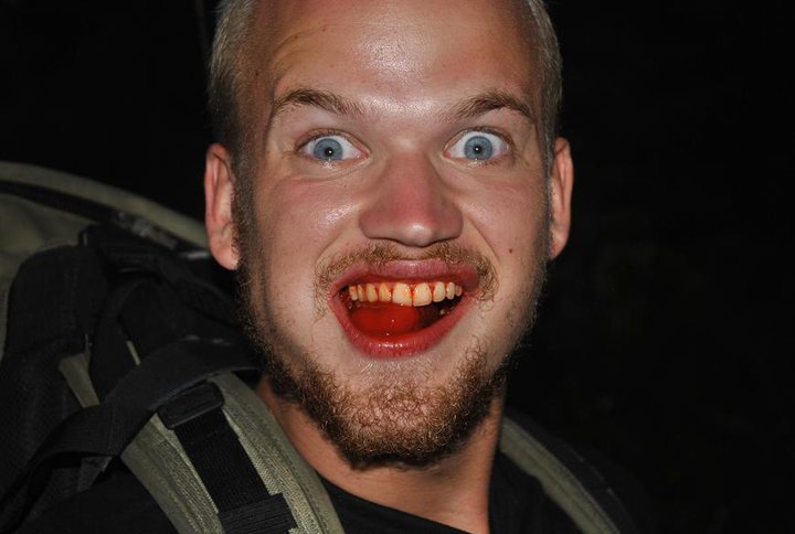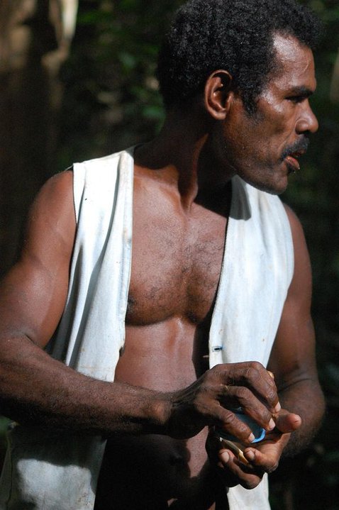 I Papua tuggar i princip alla pinang. Detta ar en not fran en sorts palm som ger ett litet rus, nastan som en fylla som ar over pa 10 minuter. Denna not fargar tanderna och lapparna roda, vilket alla Papuaner har. Dessa notter hade jag svart for i borjan da de har en valdigt speciell och besk smak. Dock har jag lart mig att alska dem. Denna bild ar fran en sen kvall nar vi stannade efter vagen och avnjot en varsin pinang. Vi borde nastan bli nominerade till varldens snyggaste man (pojkar).