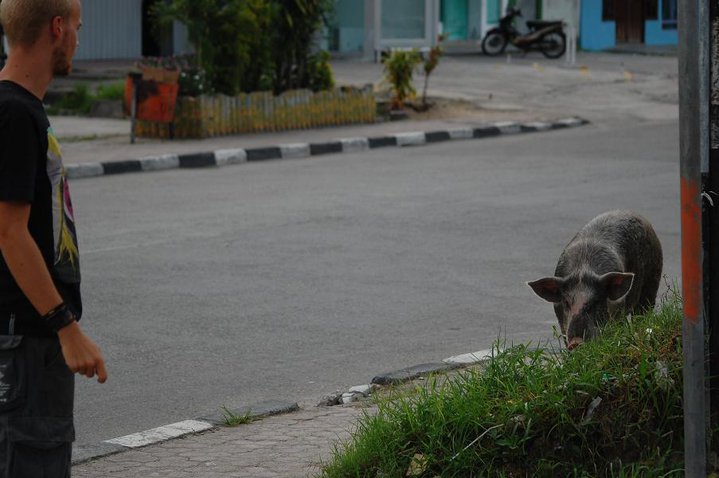 Det finns inte bara vildsvin har, det finns aven stadssvin. Dessa grisar gar runt losa mitt i Kota Biak, vilket kanske inte kanns helt sakert.
