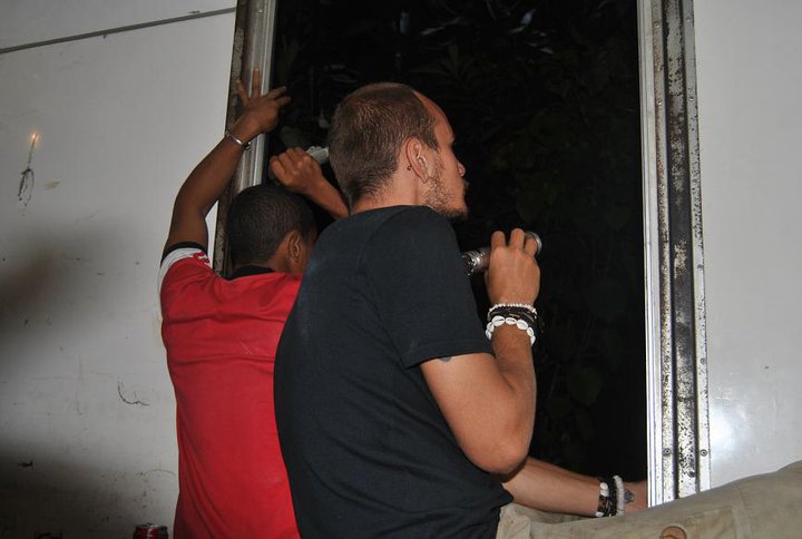 Tva man pa lastbilstaket med en stralkastare och sedan ett gang i lastbilen med ficklampor tog vi oss ut pa vagarna. Efter