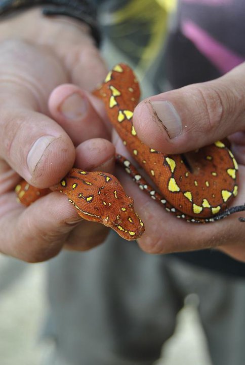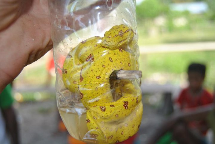 Vi har lyckats valdigt daligt med att hitta ormar har i Papuas skogar. Nagot av det vi verkligen ville se fran borjan var den grona tradpytonen. Detta fick vi anda gora, fast vi tyvarr inte i djungeln. Dessa ormar har lokalbefolkningen hittat i skogen, och vad de egentligen gor med dem vet jag inte. Den forsta och storsta pa bilderna satt fast i ett rep som var fast i en pinne. Killen som hade hittat den satt med den efter vagen och gjorde ingenting alls, som manga andra har. De tva sista, som ar juveniler av den grona tradpytonen fick bo i 50 cl petflaskor. Det kanns trakigt att behova se djuren bli behandlade sa. Biak ar en liten o, och den grona tradpytonen med lokalitet Biak finns just bara pa Biak.