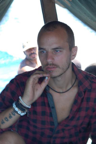 De här bilderna är från när vi precis har kommit på båten som ska ta oss hem, vi har fått en varsin Gudang Garam och jag