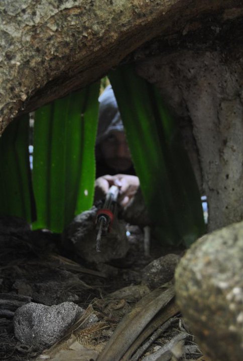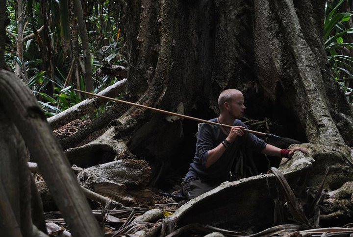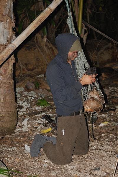 bergspariterna och vi fångade dem genom att binda fast kokosnötter utanför deras hålor och sedan smyga oss på dem när de