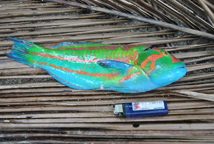 Om ni kollar på bilderna ser ni två stora blad, dessa blad hade vi lagt upp fisk på tidigare och vi hade inte upplevt